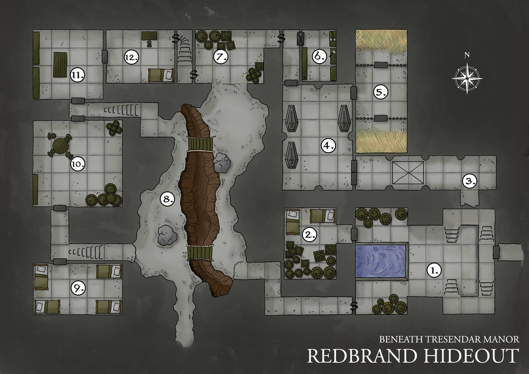 Bjorn and Nessa were finally able to finish off the other thugs allowing the party settled down for a short rest to recuperate. While they did the magical sword and staff melted out of existence. All that remained now was to deal with the Bugbears who, through a process of elimination, must be in the south-west corner of the cellar.